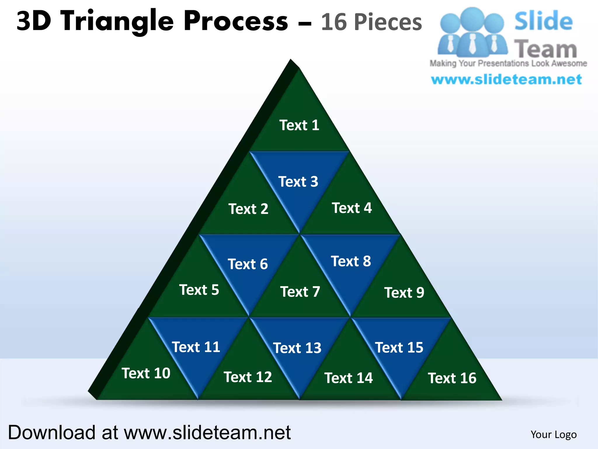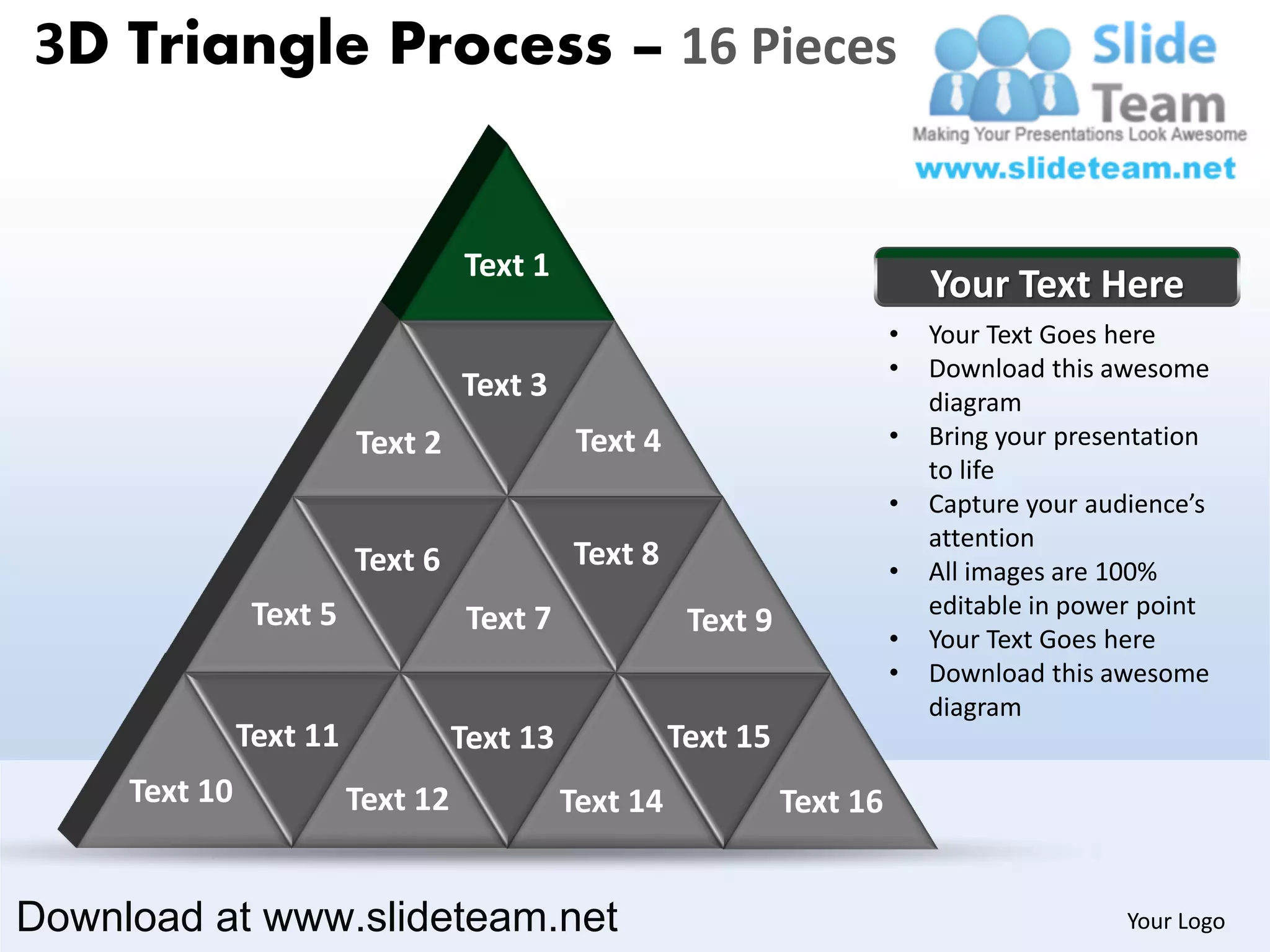 The document is a presentation template with 16 editable text boxes arranged in a 3D triangle formation. The template allows users to customize the text in each box and change features like color, size, and orientation of icons. Users can ungroup objects to edit them individually or change colors using the Format Shape dialog box in PowerPoint. The template can be downloaded from the provided website to create customizable presentations.