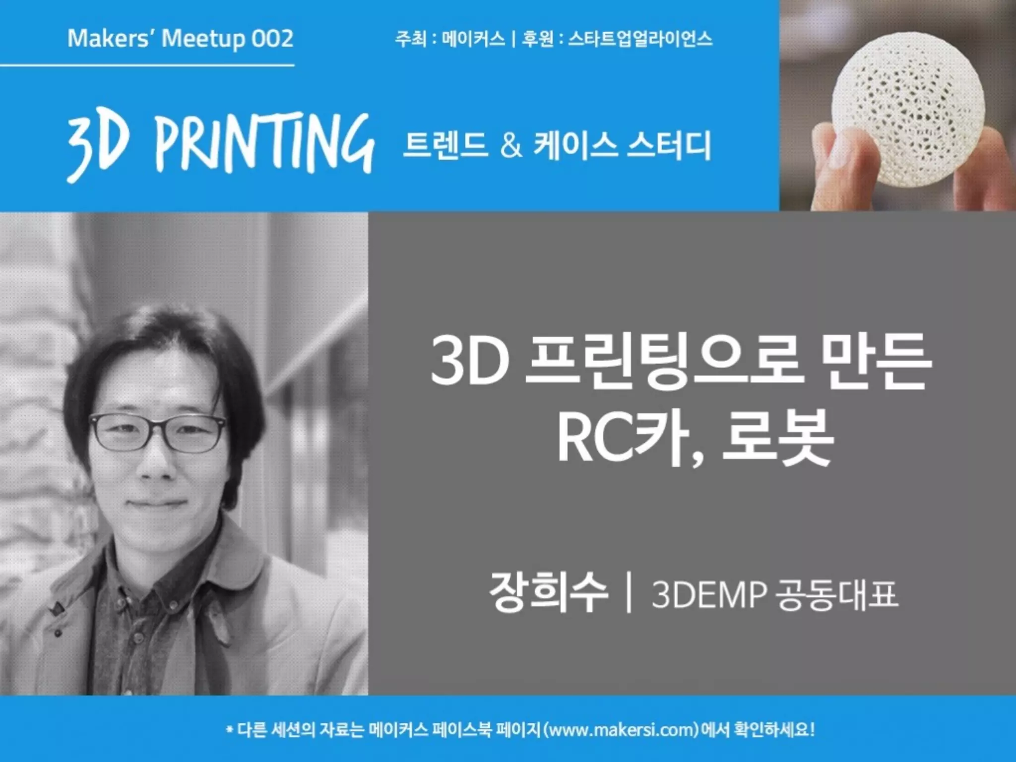 3D 프린팅으로 만드는 RC카, 로봇 - 장희수 (3DEMP) 메이커스에서 주최한 3D 프린팅 트렌드 및 케이스 스터디 세미나 발표 자료입니다. 더 많은 자료는 메이커스 페이스북 페이지(www.makersi.com)에서 확인 가능합니다.