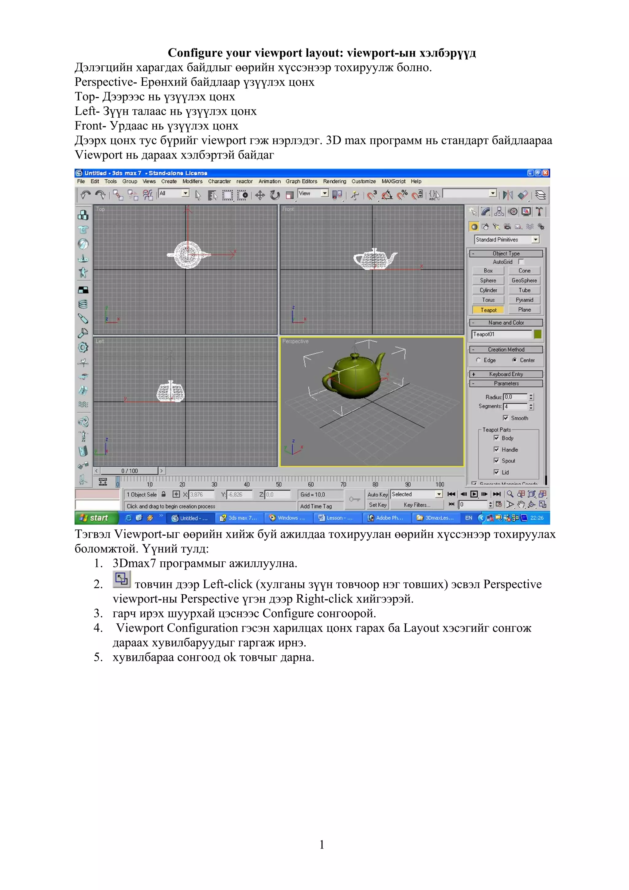 фон цагаан өнгөтэй байгаа нь 3ds max-д оруулан ажиллахад хүндрэлтэй байдаг тул өөрийн мэддэг дурын зургын программаар арын фоныг нь бараан өнгөтэй болгон өөрчилөөрэй. Viewport-ыг өөрчлөх : 1. 3ds max программыг эхлүүл. Хэрэв программыг ажиллуулчихсан байсан бол өмнөх файлаа хадгалаад File цэсний Reset коммандыг ав. 26