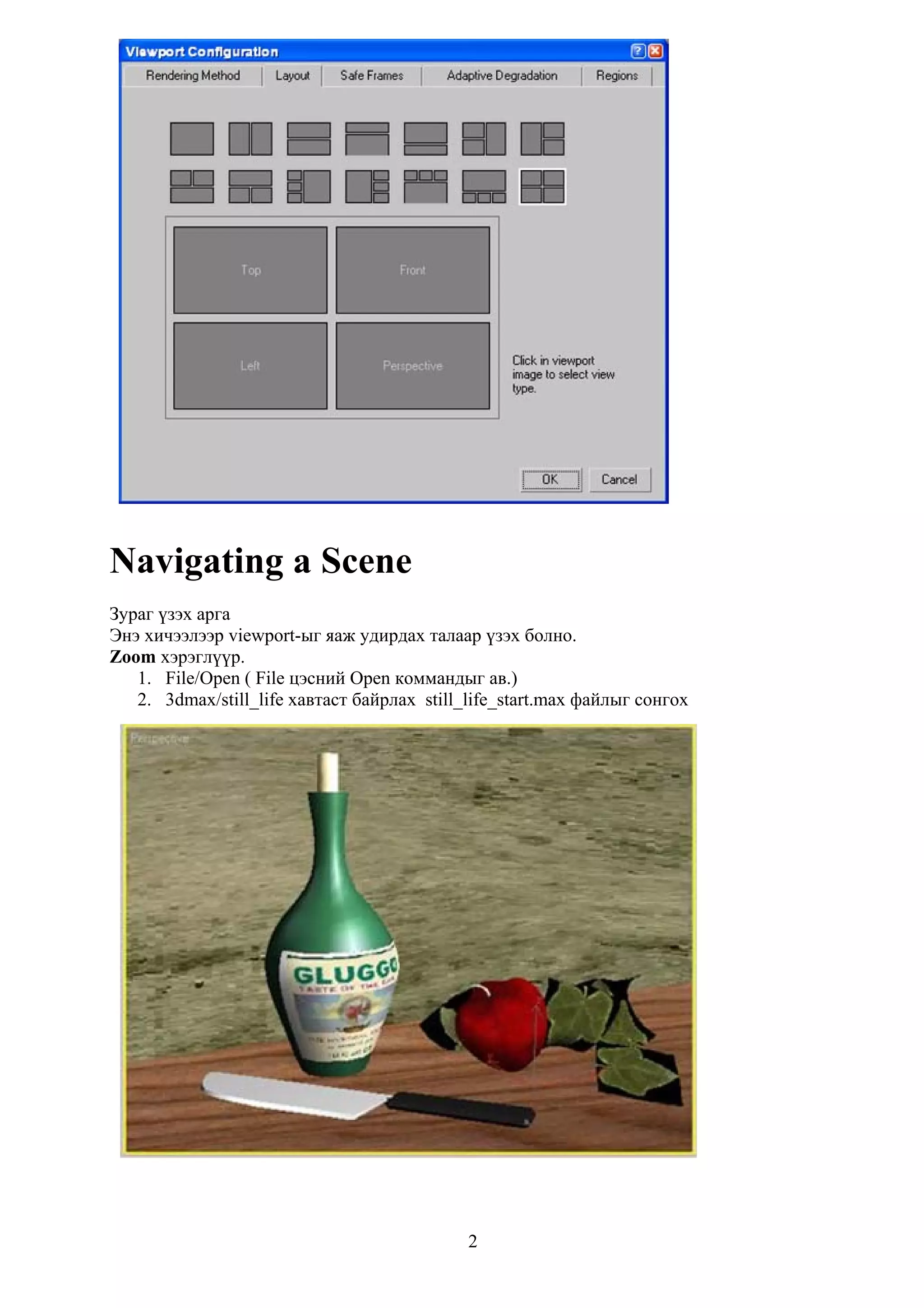 дээр click хийж идэвхижүүл. Эсвэл гараас F товчыг дарж Perspective viewpor-ыг Front viewport болгож болно. 3. Min/Max Toggle дээр click хий. Энэ үед Front viewport дангаараа дэлэгцэнд харагдах болно. Viewport-д дэвсгэр (background) зураг оруулах: 1. Views цэснээс Viewport Background коммандыг сонгоход Viewport Background харилцах цонх гарч ирнэ. Эсвэл гараас ALT+B товчыг дарж болно. 2. Background Source бүлгийн Files товчин дээр дарж файлаа сонгоно. 3. tutorialsintro_to_modeling хавтаст байрлах timegrey.jpg файлыг нээ. Энэ эмбелемийн арын фоныг бараан болгосон байгаа. 4. Aspect Ratio бүлгийн Match Bitmap сонголтыг идэвхижүүл. Энэ сонголт нь зурагын хэмжээ алдхаас сэргийлдэл. 5. Мөн Lock Zoom/Pan сонголтыг идэвхижүүл. Энэ сонголт нь арын фонд байгаа зурагыг томсгож жижигсгэж харна. 6. OK товчыг дар. 27