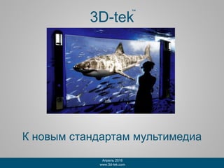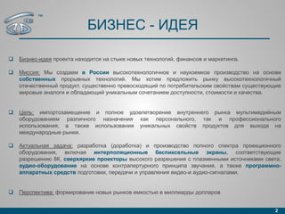Документ описывает бизнес-идею компании 3D-Tek, которая сосредоточена на производстве высокотехнологичного мультимедийного оборудования в России с использованием собственных технологий. Миссия компании заключается в создании доступных и качественных решений для внутреннего рынка с возможностью выхода на международные рынки, а также в разработке уникального проекционного оборудования и акустических систем. 3D-Tek нацелена на импортозамещение и полное удовлетворение потребностей различных сегментов рынка, предлагая инновационные решения в области мультимедиа.