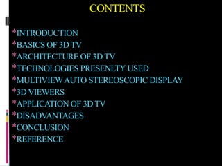 3-D TV uses two cameras to capture slightly different images for the left and right eyes, creating a 3D effect when viewed with special glasses. It transmits the two images via an encoder and displays them on a 3D-enabled TV using technologies like shutter glasses or polarized filters. While 3D TV provides an immersive experience, health concerns remain about prolonged viewing and industry standards have not been fully defined.