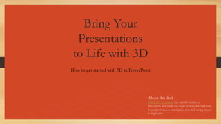 This document provides instructions for adding and manipulating 3D models in PowerPoint. It explains that Office 365 subscribers can insert 3D models from online sources or import their own 3D files. It then demonstrates how to position and rotate 3D models using controls or preset views. The document also shows how to animate 3D models using morph transitions between identical slides or built-in animation options like turntable. The goal is to bring presentations to life and foster understanding through interactive 3D visualization.