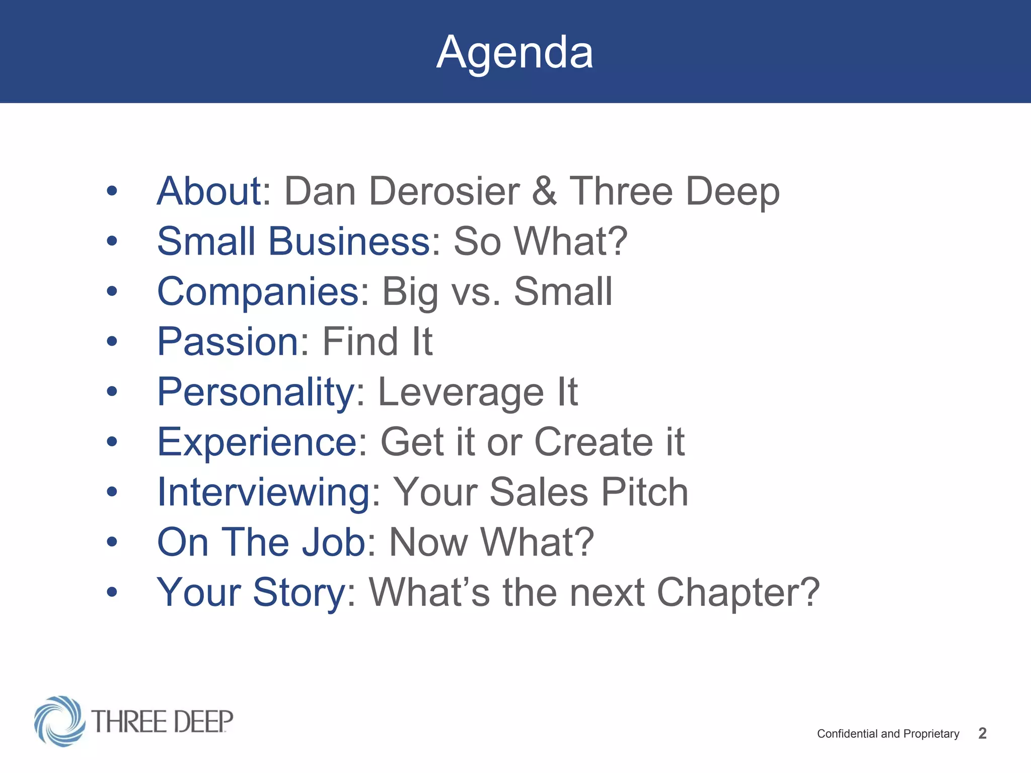 The presentation discusses the significance of small businesses in the U.S. economy, which represent 99.7% of employer firms and generate 65% of net new jobs. It contrasts small and large companies, highlighting advantages of both in terms of resources, impact, pace, and development opportunities. Additionally, it emphasizes the importance of passion, personality, and job experience in career success.