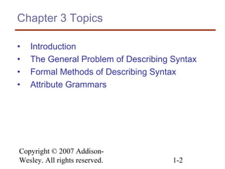 This document discusses formal methods for describing the syntax and semantics of programming languages, including attribute grammars. It begins by introducing syntax and semantics, and the problem of formally defining a language. It then covers context-free grammars and Backus-Naur form (BNF) as a way to describe syntax. Attribute grammars are introduced as a method to incorporate semantic information into syntax rules through attributes and functions. An example attribute grammar checks for type consistency in an expression grammar.