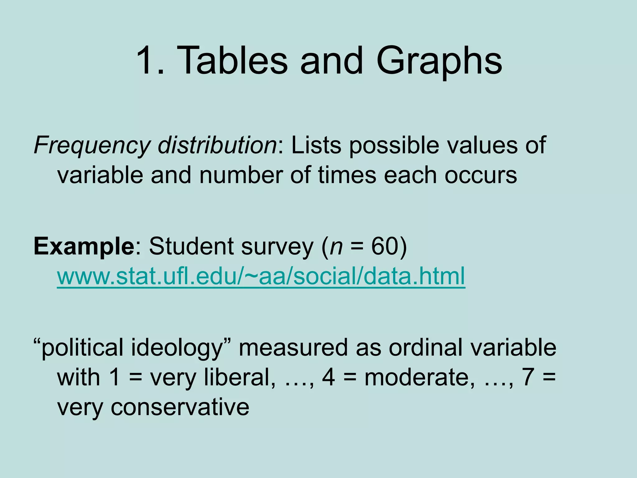 This document provides an overview of descriptive statistics techniques for summarizing and describing data, including both categorical and quantitative variables. It discusses frequency distributions, histograms, stem-and-leaf plots, numerical descriptions of center and variability (mean, median, standard deviation), bivariate descriptions using tables, scatterplots and correlation, and simple linear regression. The goal of descriptive statistics is to organize and summarize sample data in order to make inferences about the corresponding population parameters.