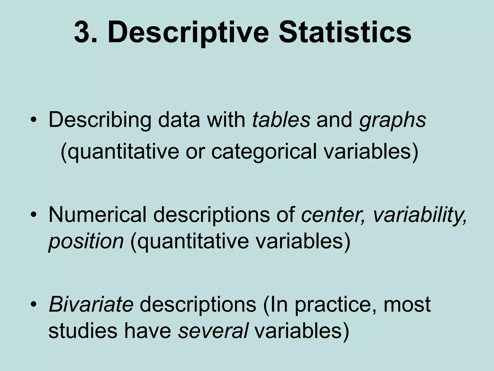 This document provides an overview of descriptive statistics techniques for summarizing and describing data, including both categorical and quantitative variables. It discusses frequency distributions, histograms, stem-and-leaf plots, numerical descriptions of center and variability (mean, median, standard deviation), bivariate descriptions using tables, scatterplots and correlation, and simple linear regression. The goal of descriptive statistics is to organize and summarize sample data in order to make inferences about the underlying population.