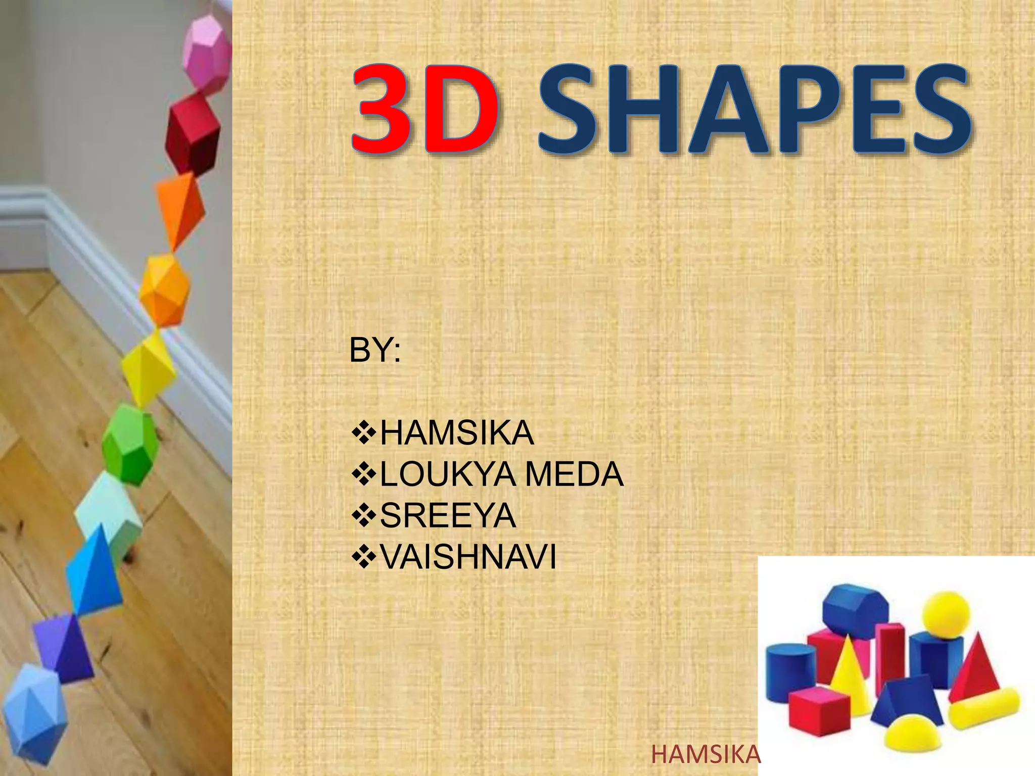 Three types of three-dimensional figures are described: solids with height, width, and depth like real-world objects; hollow or solid geometric shapes; and also called solid geometric figures. Common 3D shapes include cubes, cuboids, spheres, cones, cylinders, prisms and pyramids. The parts of 3D shapes are defined as faces, edges and vertices. Specific details are provided on the characteristics of cubes, cuboids, cones, cylinders, spheres, prisms and pyramids including their key features of faces, vertices and edges.