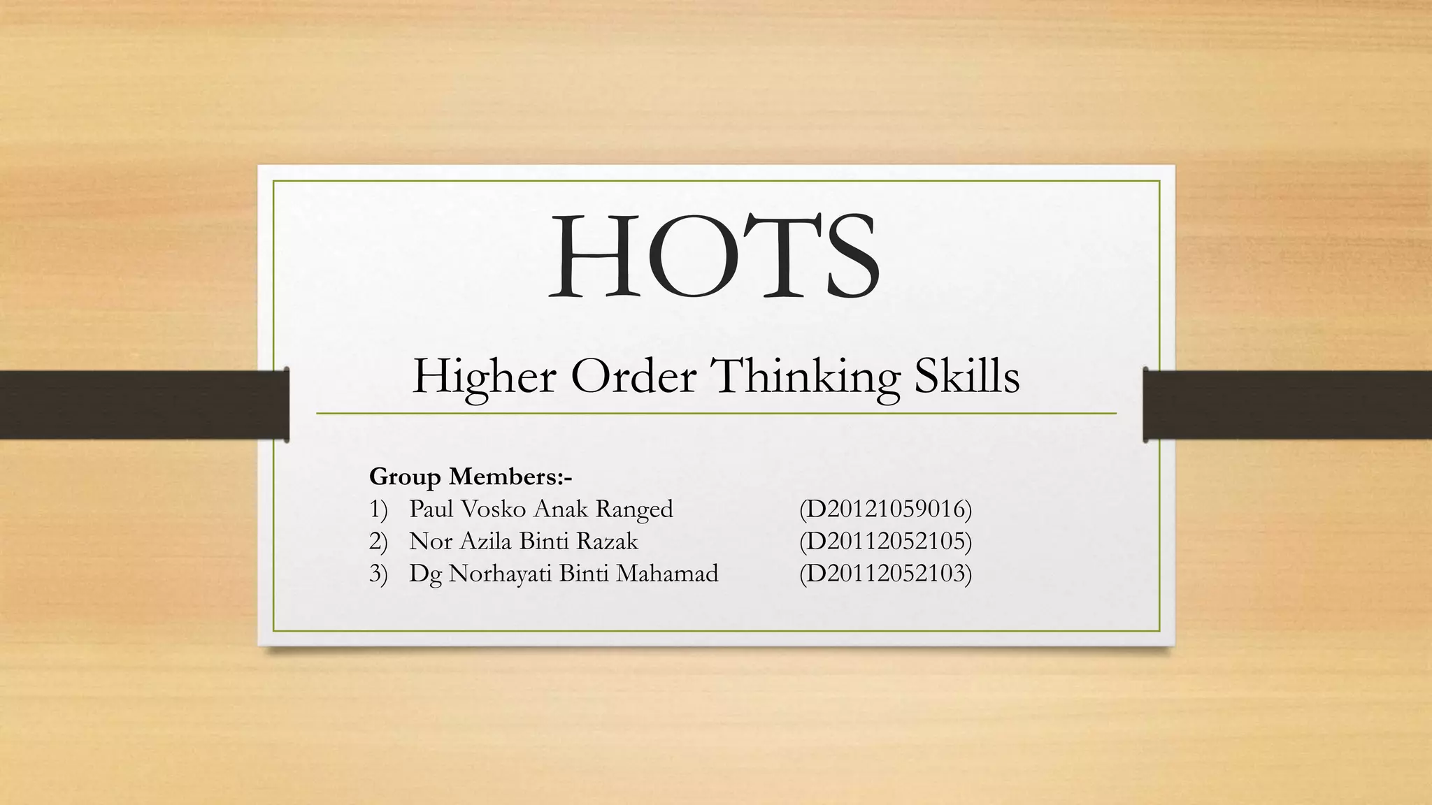 Higher-order thinking skills (HOTS) involve skills beyond basic recall of facts, such as analysis, synthesis, and evaluation. HOTS allow students to interpret information in new ways, draw alternative conclusions, and transfer skills to new situations. Developing HOTS is important for students to effectively apply their knowledge and think in more productive ways. Strategies for enhancing HOTS include explicitly teaching thinking concepts and skills, guiding students to categorize concepts, moving between concrete and abstract examples, and using questioning techniques.