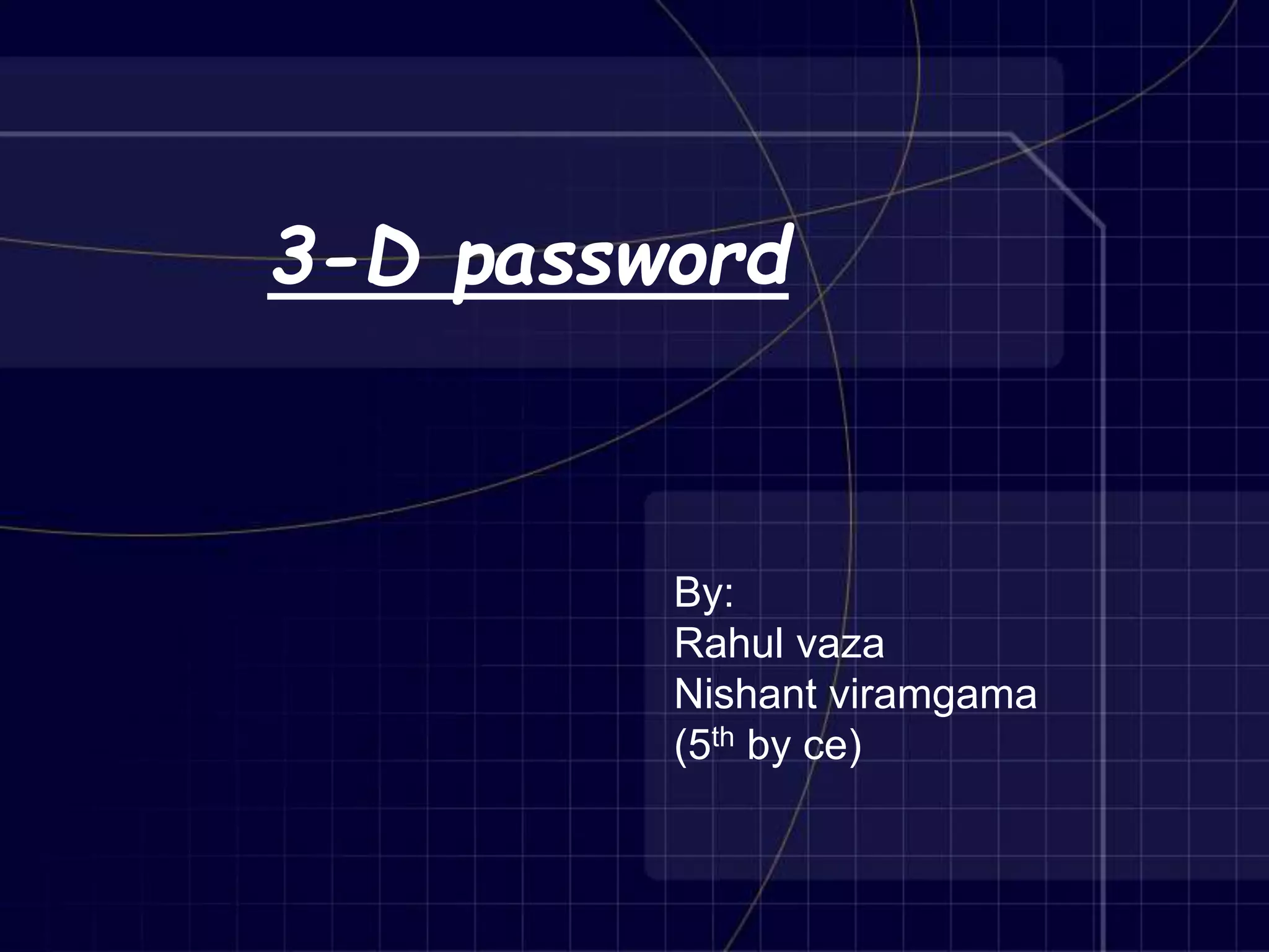 3-D passwords combine multiple authentication methods like passwords, biometrics, and tokens into a 3-D virtual environment. To log in, a user navigates the environment and interacts with virtual objects in a specific sequence. This creates a large number of possible passwords that are difficult for attackers to guess. The document provides guidelines for designing effective 3-D virtual environments, such as making objects unique and scaling the environment based on the system's security needs. 3-D passwords could protect critical systems and are more secure than traditional text passwords.