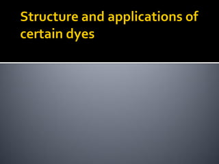 Dyes are coloured organic compounds that can impart their colour to other substances. To be an effective dye, a compound must have a suitable colour, be capable of firmly binding to fibers, and retain its colour after binding. It should also be stable during dry cleaning. Common dyes include malachite green, orange dyes, alizarin, martius yellow, indigo, congo red, quercetin, and para red. The chromophore is responsible for colour and contains an unsaturated group, while auxochromes intensify colour. Resonance contributes to dye colour by allowing pi electrons to absorb radiation. Dyes find applications in silk, wool, synthetic fibers, biological staining, indicators, and food colouring
