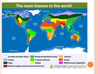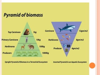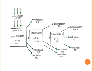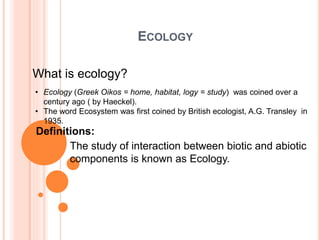 The document provides an overview of ecology, defining it as the study of interactions between biotic and abiotic components of ecosystems. It describes various ecosystems, the roles of producers and consumers, ecological succession, energy flow, and biogeochemical cycles, along with the classification of biomes. Key concepts include trophic levels, competition, and the significance of food chains and webs in ecological energy transfer.