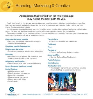 The document discusses branding, marketing, and creative services provided by The Eastco Group. It summarizes that their integrated team can weave together various marketing strategies, including branding, graphics, video, web, traditional, social media, and more. Their synergy across companies provides clients with cost savings and services all under one roof. They help decode customers and audiences through research and analytics to focus on retention and relationship marketing. Their full suite of services also includes advertising, public relations, media buying, fulfillment, printing, packaging, video production, and digital strategies.