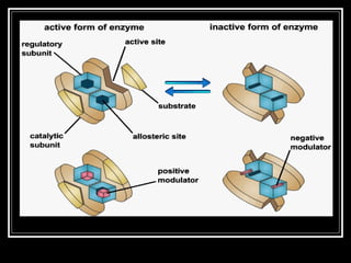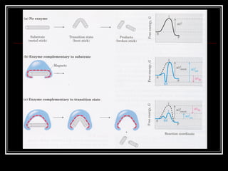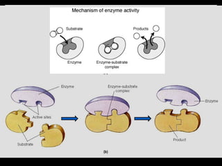 Enzim merupakan protein yang berfungsi sebagai katalisator untuk mempercepat reaksi kimia dalam tubuh dengan menurunkan energi aktivasi. Enzim bekerja dengan cara mengikat substrat di sisi aktifnya dan menciptakan lingkungan yang memungkinkan terjadinya reaksi. Aktivitas enzim dipengaruhi oleh berbagai faktor seperti pH, suhu, konsentrasi substrat, dan inhibitor.