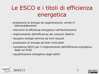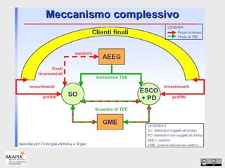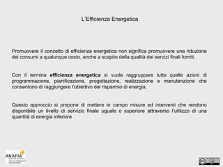 Il documento tratta l'efficienza energetica, enfatizzando interventi come la produzione di energia da fonti rinnovabili e il miglioramento dei consumi elettrici. Viene evidenziata l'importanza degli audit energetici nella valutazione delle opportunità di risparmio, supportate da normative e decreti per incentivare le imprese nel perseguire obiettivi di efficienza. Infine, ci sono dettagli sui ruoli delle ESCO e le misure di certificazione e verifica dei risparmi energetici.