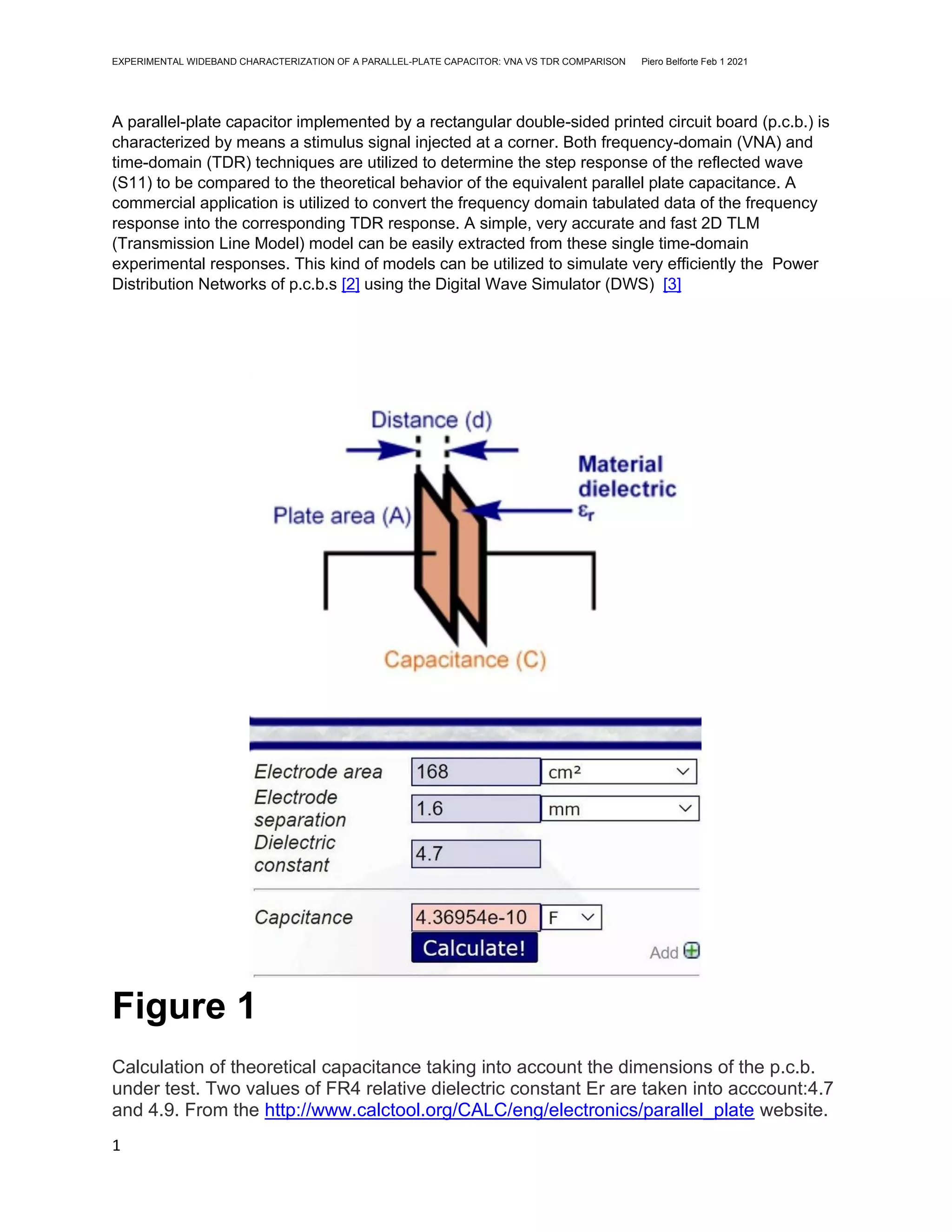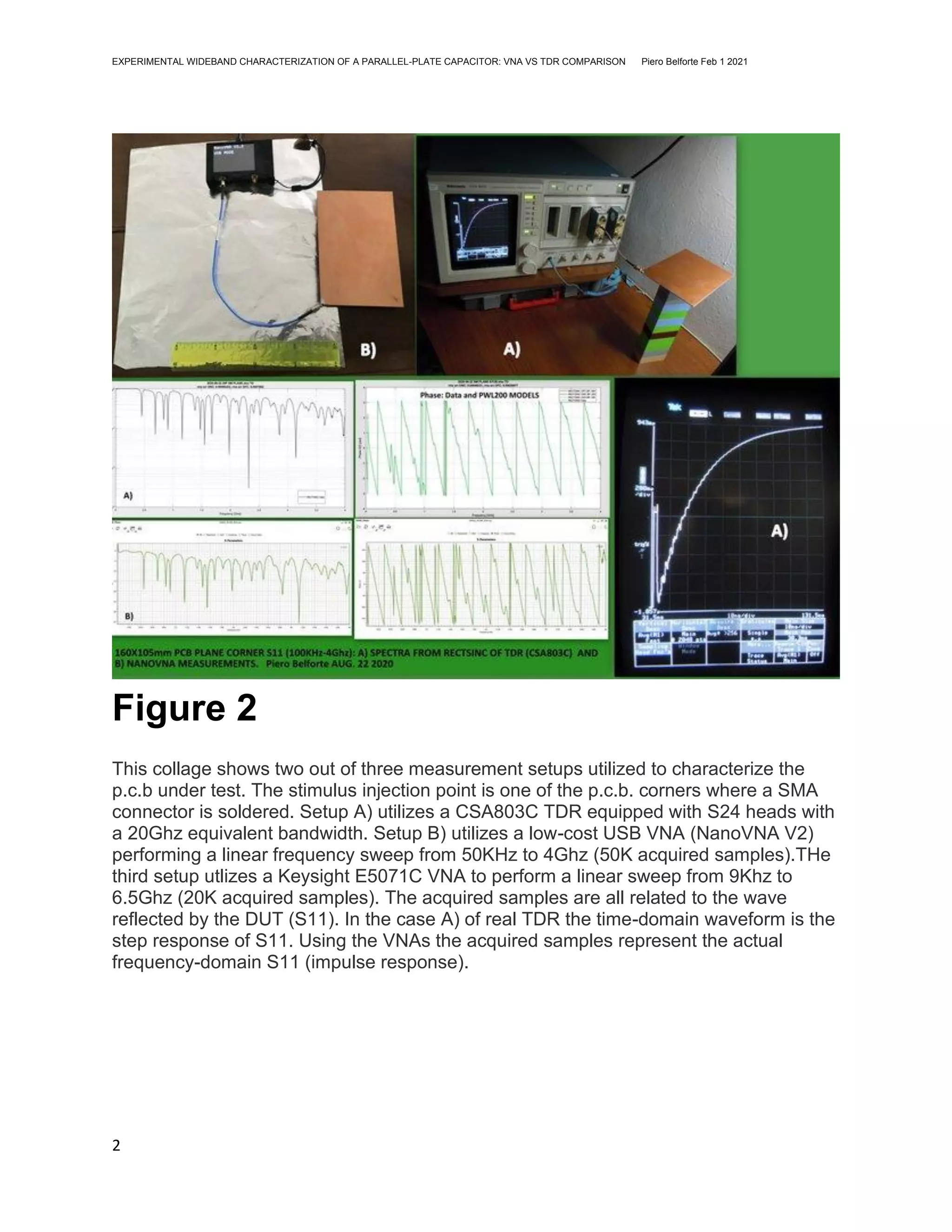 The document presents a comparison of frequency-domain (VNA) and time-domain (TDR) techniques for characterizing a parallel-plate capacitor using a printed circuit board. It explores the accuracy of the measured responses relative to theoretical models and discusses the impact of calibration and frequency alignment on results. Additionally, it highlights the efficiency of a new 2D TLM model for simulating power distribution networks using data obtained from the experiments.