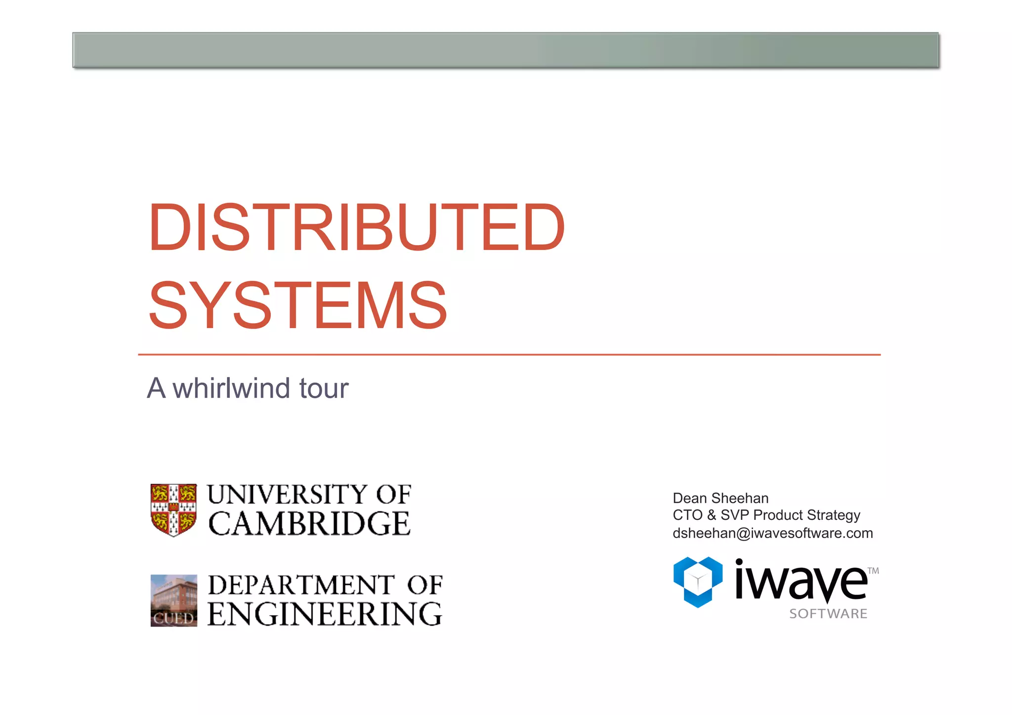 This document provides a high-level overview of key concepts in distributed systems, including programming models, remote procedure calls, messaging, distributed data, peer-to-peer networks, distributed hash tables, cloud computing, and security. It discusses implicit and explicit programming models, synchronous and asynchronous communication, and distributed computing frameworks like MapReduce.