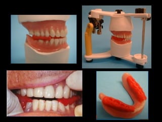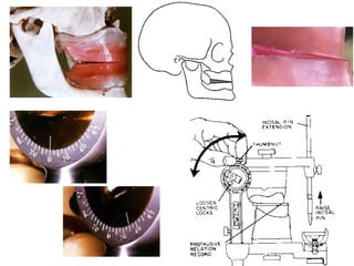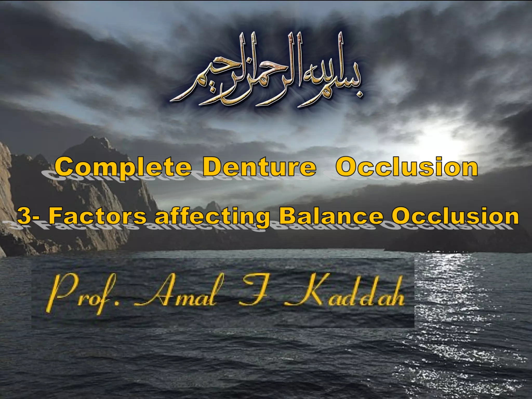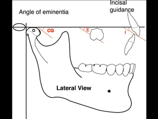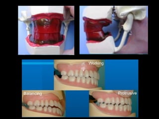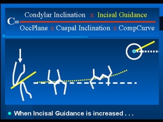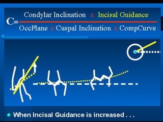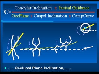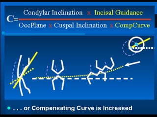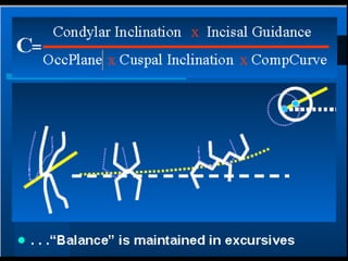 This document discusses the key factors involved in developing balanced occlusion for complete dentures. It outlines five main factors: 1) Condylar guidance, 2) Incisal guidance, 3) Plane of occlusion, 4) Compensating curves, and 5) Cusp angle. It describes how each factor influences mandibular movement and must be considered in relation to the others to achieve balanced occlusion without trauma to tissues. Formulas from Hanau and Theilmann relate these five factors and how modifying one requires adjusting the others to maintain occlusion balance.