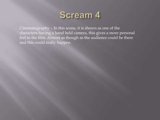 The document discusses cinematography, sound, editing, and mis-en-scene techniques used in two horror movie trailers. For the first trailer, a handheld camera is used to give a personal feel, a single voice emphasizes a character's presence, and the main props are important to the film's point. Blank shots with no sound build suspense. For the second trailer, long shots and dim lighting create tension, blank shots with potential sounds scare the audience, red tinting gives an ominous feeling, and a normal-seeming barn setting implies danger could be anywhere.