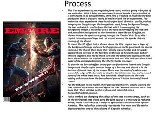 - The document describes experiments conducted for a magazine front cover project, including adding a 3D effect to overlapping text and sparks from the background image, including a barcode image from Google, and adjusting text colors.