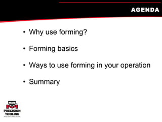 The document discusses forming solutions for increasing efficiency in manufacturing operations. It provides an overview of why forming is useful, examples of how it can replace or improve upon other processes like punching, and basics of forming like considerations for setup and maximum form heights. Key advantages of forming include increased efficiency, expanded capabilities, and elimination of secondary operations.