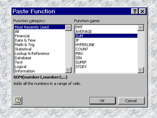 This document provides an overview of formulas and functions in MS Excel. It explains that formulas perform calculations using values, cell references, operators, and functions. Common operators include arithmetic, comparison, and reference operators. The document lists many important functions organized by category and provides examples of commonly used functions like SUM, AVERAGE, IF, and VLOOKUP. It describes proper syntax for functions and how functions can be nested within other functions.