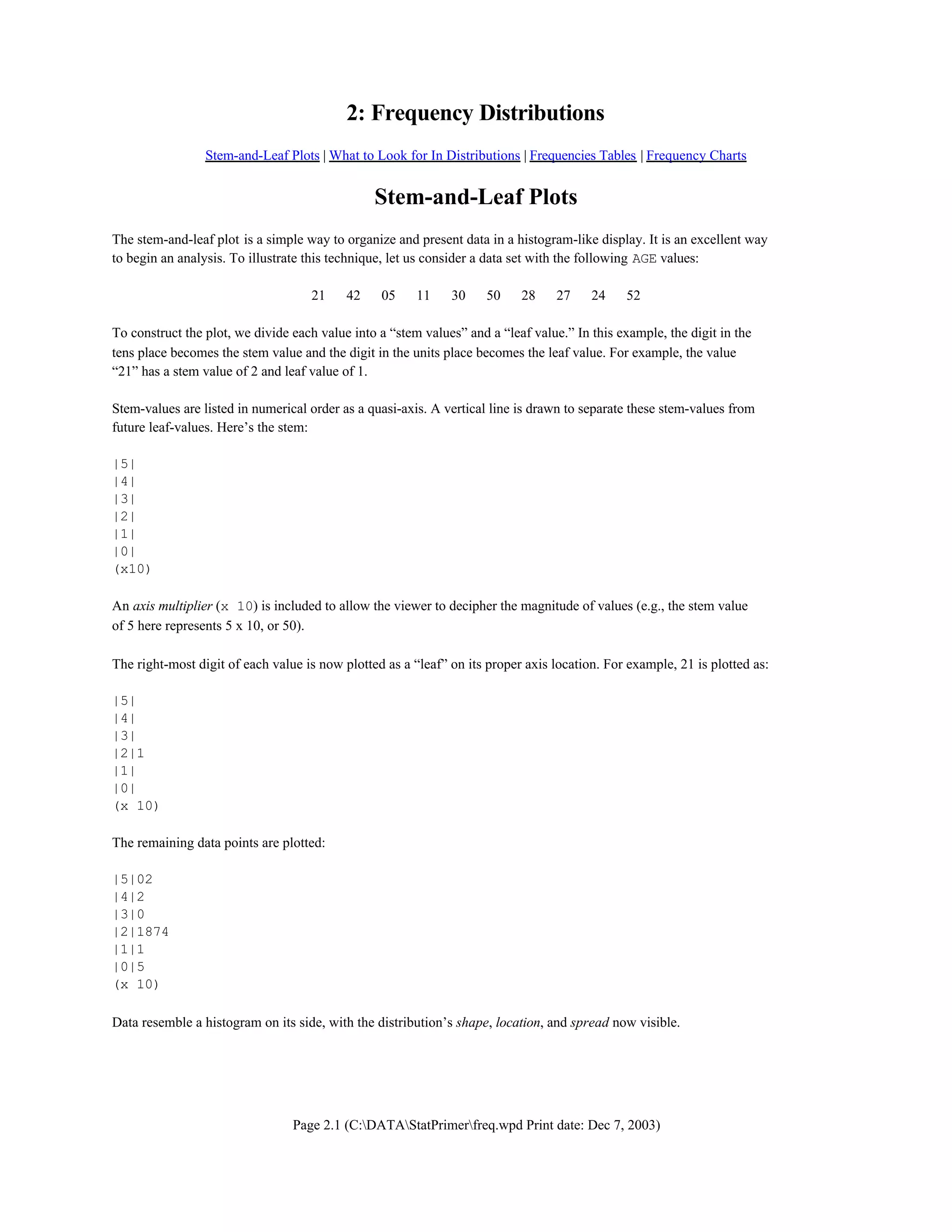 This document provides instructions for creating and interpreting stem-and-leaf plots. It explains that stem-and-leaf plots organize data into "stems" and "leaves" to display the shape, center, and spread of a distribution similar to a histogram. The document includes three examples of constructing stem-and-leaf plots from different data sets and discusses how to interpret the plots, including identifying the median. It also briefly describes how to create frequency tables from raw data.