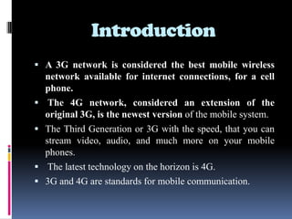 3G and 4G are mobile network standards, with 4G providing faster data transfer rates of up to 100 MB/sec compared to 3G's 3.1 MB/sec. 3G allows broadband internet and streaming of audio/video on mobile phones, while 4G provides ultra-broadband access and higher resolution mobile TV. Key differences include 4G having faster transmission speeds, supporting both LAN and WAN networks, and operating on higher frequency bands of 2-8 GHz versus 3G's 1.8-2.5 GHz. Mobile banking uses both 3G and 4G technologies to enable transactions like funds transfer and trading via mobile handsets.