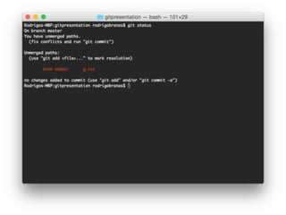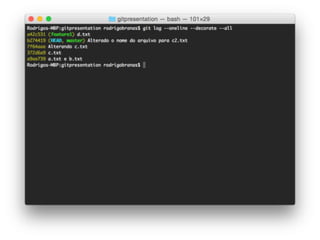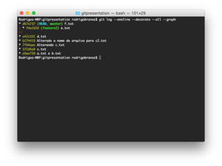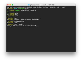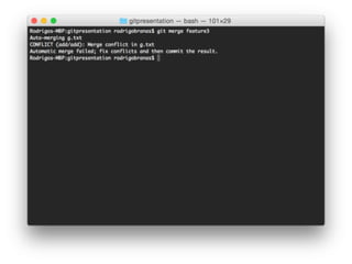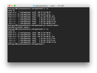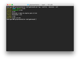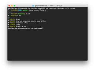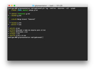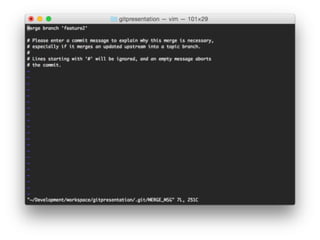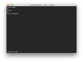 The document discusses Git branches and merging. It provides examples of creating branches, making commits on different branches, switching between branches, and merging branches using both fast-forward and recursive strategies. It also covers resolving merge conflicts that can occur when changes are made to the same file on different branches.
