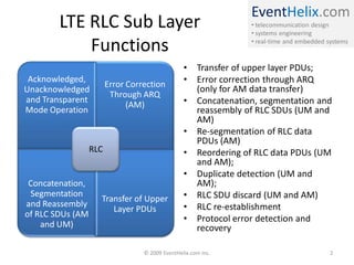 The document describes the Radio Link Control (RLC) sub layer in 3GPP LTE, including its functions, modes of operation (unacknowledged, acknowledged, and transparent), state variables, procedures for transmitting and receiving data, and retransmission processes. The RLC sub layer provides transfer of upper layer PDUs, error correction, segmentation/reassembly, reordering, duplication detection, and supports both acknowledged and unacknowledged data transfer.