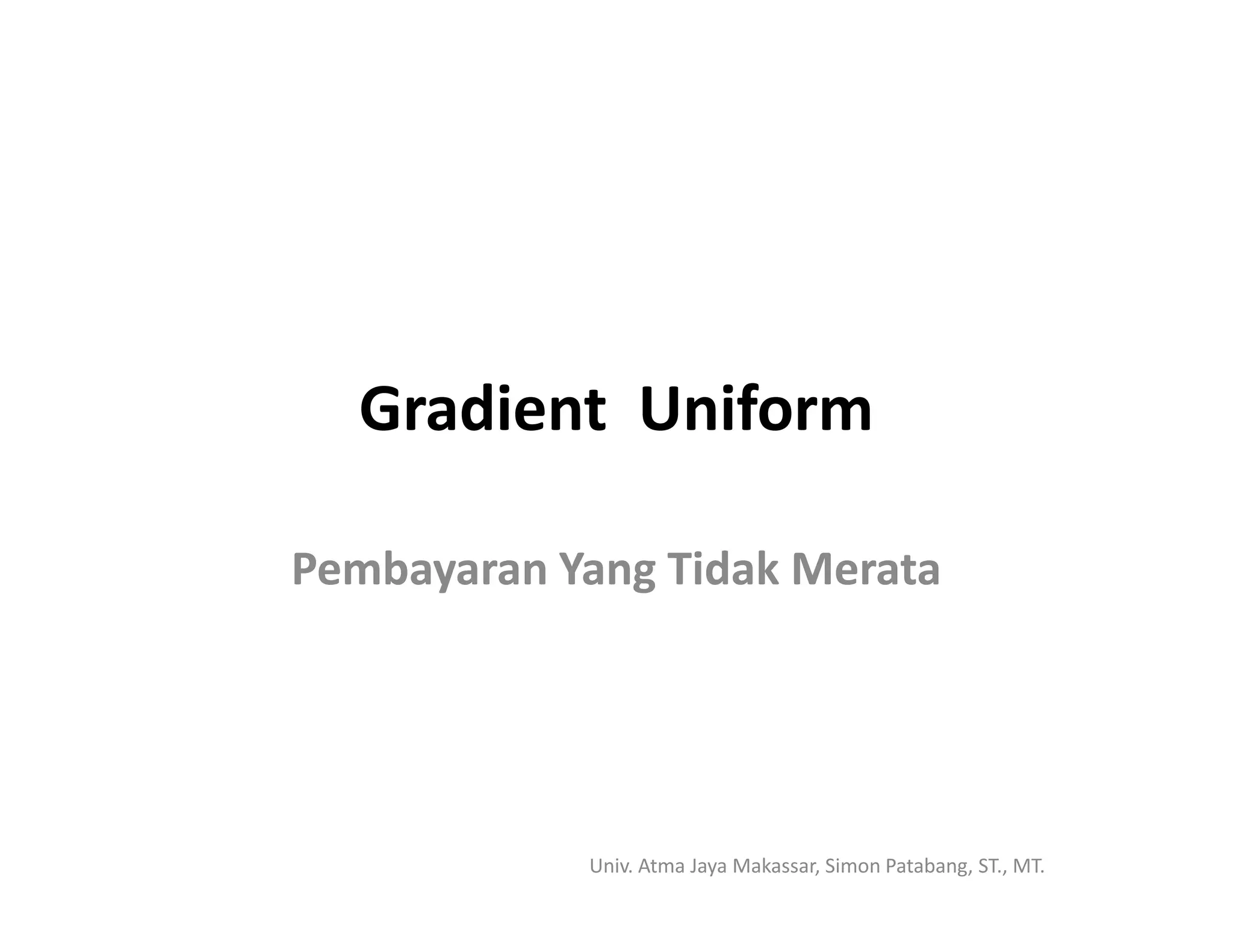 1. Dokumen tersebut membahas tentang gradient uniform atau pembayaran yang teratur dimana besarnya jumlah pembayaran mengalami kenaikan atau penurunan per tahun dengan jumlah yang sama. Metode ini digunakan untuk mengkonversi pembayaran yang tidak merata menjadi pembayaran tahunan yang setara.