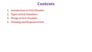 - There are three main types of grit chambers: horizontal flow, aerated, and vortex. Horizontal flow uses gravity settling, aerated uses air to create spiral flow, and vortex uses tangential inflow to induce a vortex.