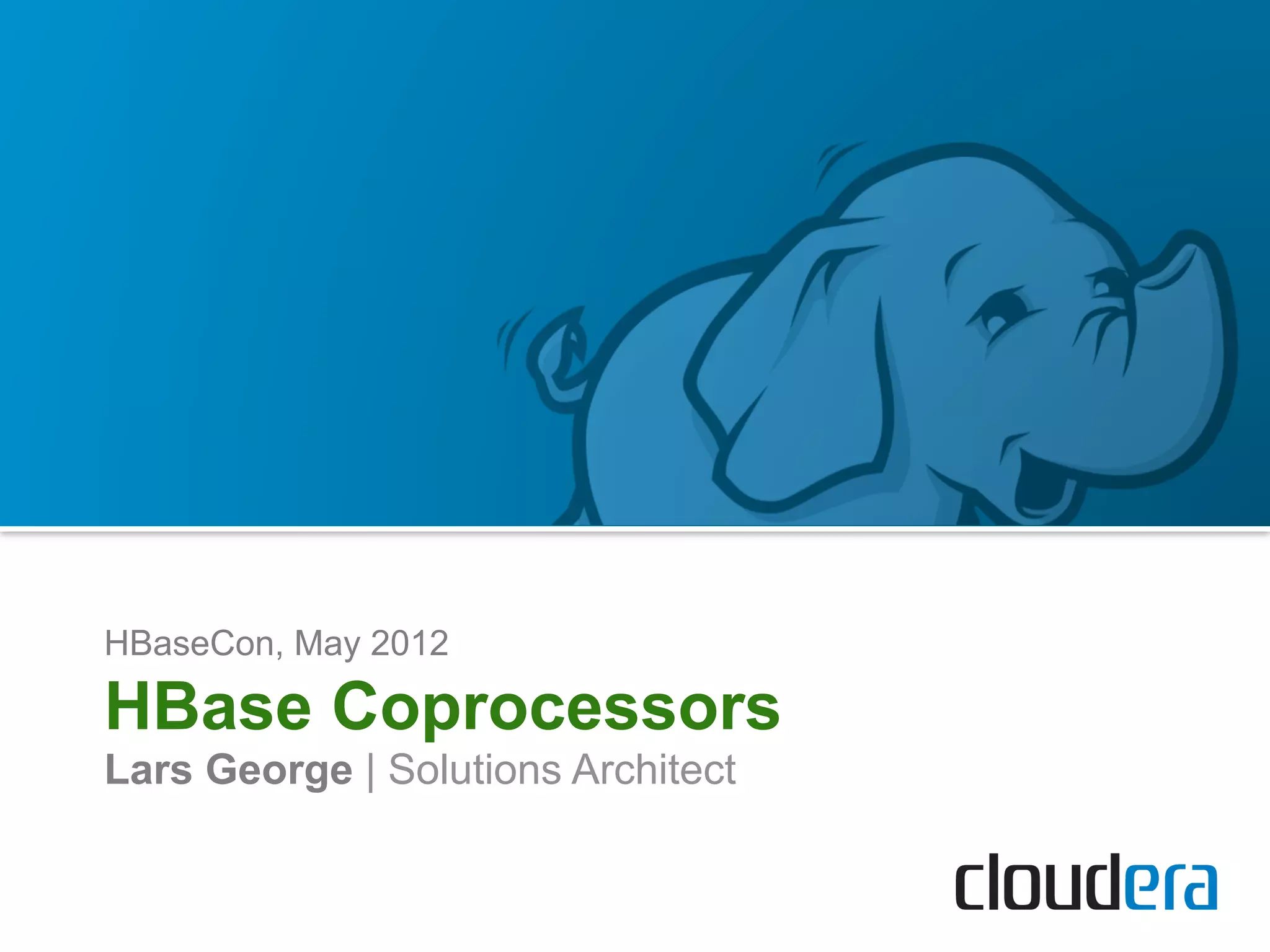 HBase Coprocessors allow user code to be run on region servers within each region of an HBase table. Coprocessors are loaded dynamically and scale automatically as regions are split or merged. They provide hooks into various HBase operations via observer classes and define an interface for custom endpoint calls between clients and servers. Examples of use cases include secondary indexes, filters, and replacing MapReduce jobs with server-side processing.