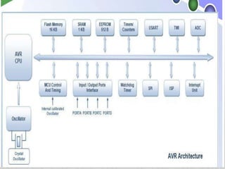 This document provides information about hardware components used in a microcontroller project including an ATmega16 microcontroller, L293D motor driver IC, 7805 voltage regulator, and an AVR development board. It describes the ATmega16 architecture and pin configuration, the functions of the L293D for driving motors, specifications of the 7805 voltage regulator for providing 5V power, and briefly mentions the AVR development board.