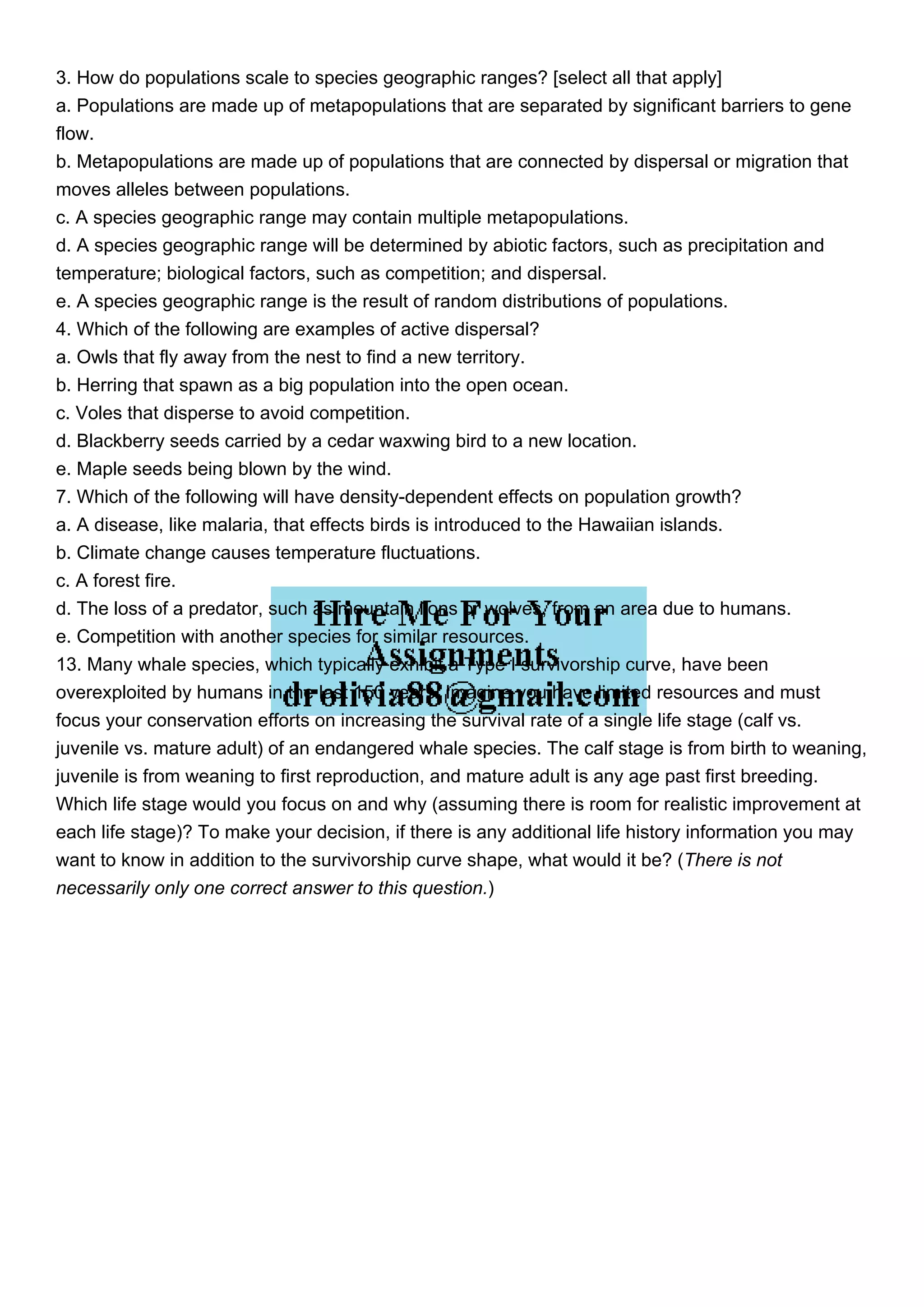 The document discusses factors influencing the geographic range of species, highlighting the roles of metapopulations and environmental conditions. It lists examples of active dispersal, such as owls flying away from nests and seeds being carried by animals or wind. Additionally, it examines density-dependent effects on population growth and considers conservation strategies for whale species, specifically focusing on which life stage may benefit most from conservation efforts.