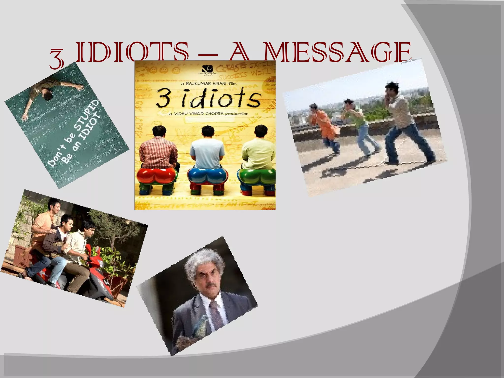 The document discusses themes from the movie 3 Idiots. It argues that colleges have become focused on exams rather than learning. It encourages students to follow their passions, think differently, and chase excellence rather than just success. It highlights examples from the movie where characters demonstrate presence of mind, thinking differently, and pursuing their dreams despite criticism. The document asserts the movie's message is not to criticize education but encourage free thinking in students.