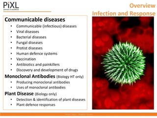 The document discusses different types of infectious diseases caused by pathogens such as viruses, bacteria, fungi and protists. It provides examples of viral diseases like measles and HIV, bacterial diseases including salmonella and gonorrhoea, and the fungal disease rose black spot and the protist disease malaria. The document explains how these diseases are transmitted and potential treatments or methods of control.