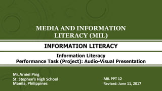 This document outlines a lesson plan on media and information literacy (MIL) for a high school class. It includes learning competencies focused on defining information literacy, locating and evaluating information, and creating an audio-visual presentation. Students will work in groups to produce a 3-4 minute presentation on what information literacy is and why it is important. They will be assessed on content, quality, citations, and cooperation based on a provided rubric.