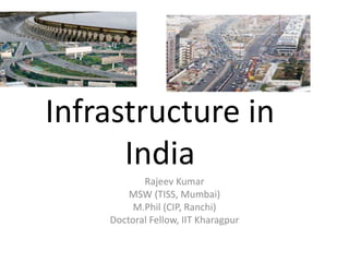 India's infrastructure plays an important role in its economic development but lacks world-class infrastructure, which pulls down GDP growth by 1-2% annually. Infrastructure includes electricity, railways, roads, ports, airports, irrigation, and sanitation. India needs to invest over $1 trillion in infrastructure by 2019 to support sectors like energy, transport, communication, education, and health. Improving infrastructure can increase national income, employment, urbanization, attract foreign investment, and support rural development. However, India faces challenges like difficulties acquiring land, funding constraints, poor planning and execution, and population growth.