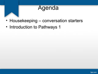 This document summarizes an academic class on gender and society. It includes an agenda that covers housekeeping, an introduction to pathways, and conversation starters. There is a discussion of the textbook topics and skills. The document outlines discussions on the differences between gender and sex, masculine and feminine behaviors, and culture's influence on gender stereotypes based on studies. It directs students to have group discussions responding to topics on the readings and videos. Homework includes adding a conversation starter to a Google Doc and buying the textbook.