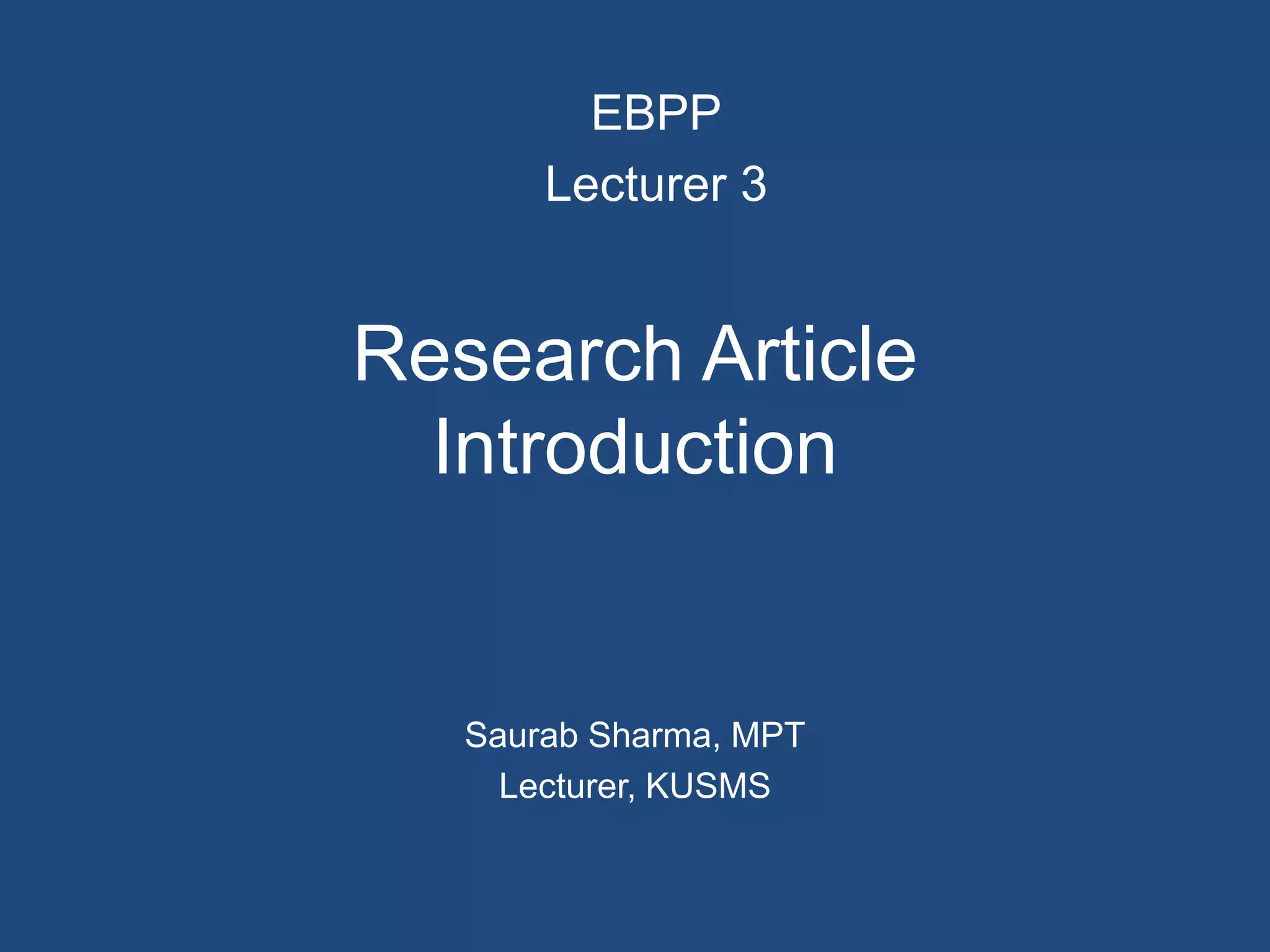 The document discusses the components and structure of a research article. It identifies the key parts as the title, authors and affiliations, abstract, introduction, methods, results, discussion, conclusion, acknowledgements, and references. The introduction provides background and rationale for the study and states the objectives/hypothesis. The methods section describes the study design, participants, measures, and analysis. The results section presents the findings of the study through tables and figures. The discussion section interprets the results in relation to previous studies and discusses limitations and future research.