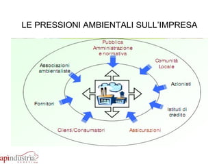 Il documento analizza le pressioni ambientali sulle imprese e le soluzioni gestionali per affrontarle, evidenziando le normative di comando e controllo, strumenti economici e approcci volontari. Viene discusso il sistema di gestione ambientale (SGA), con riferimento a standard come ISO 14001 ed EMAS, includendo procedure per la pianificazione, attuazione e controllo delle performance ambientali. Infine, si affrontano le opportunità per le imprese derivanti dall'adozione di pratiche sostenibili e dalla certificazione ambientale.