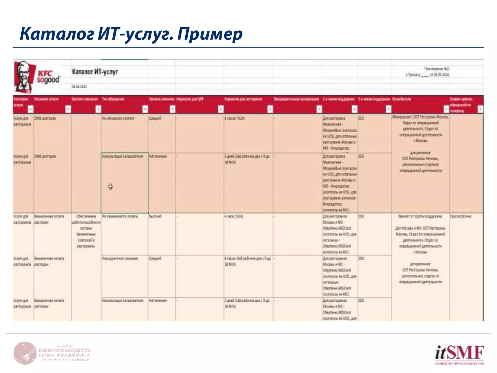 В документе описывается Всероссийская конференция ITSMF, проходившая в Москве 17-18 сентября 2014 года, на которой участники обсуждали развитие услуг управления информационными технологиями. Упоминается создание и внедрение каталога услуг в компании, начиная с января до сентября 2014 года, включая ключевые даты и этапы проекта. Основное внимание уделяется взаимодействию между поставщиками и потребителями IT-услуг.