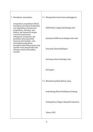 Dokumen ini menguraikan kompetensi inti dan dasar pendidikan Pancasila dan Kewarganegaraan untuk tingkat SMA, menekankan nilai-nilai agama, Pancasila, serta tanggung jawab sebagai warga negara. Terdapat penekanan pada pemahaman, penerapan, dan analisis berbagai aspek hukum, sosial, dan politik dalam konteks berbangsa dan bernegara. Selain itu, dokumen ini juga mencakup pengembangan sikap toleransi dan partisipasi aktif dalam masyarakat untuk memperkuat kesatuan bangsa.