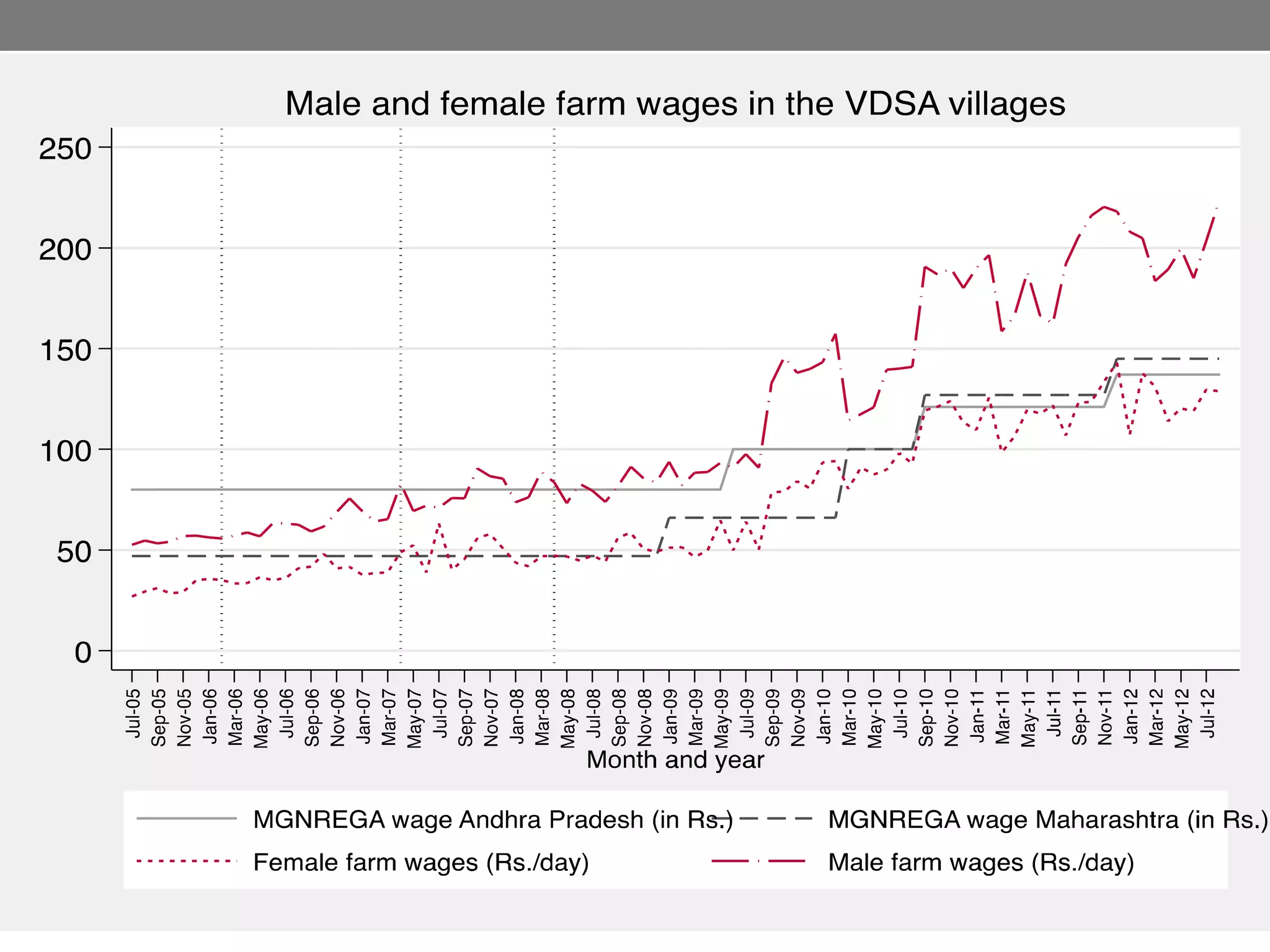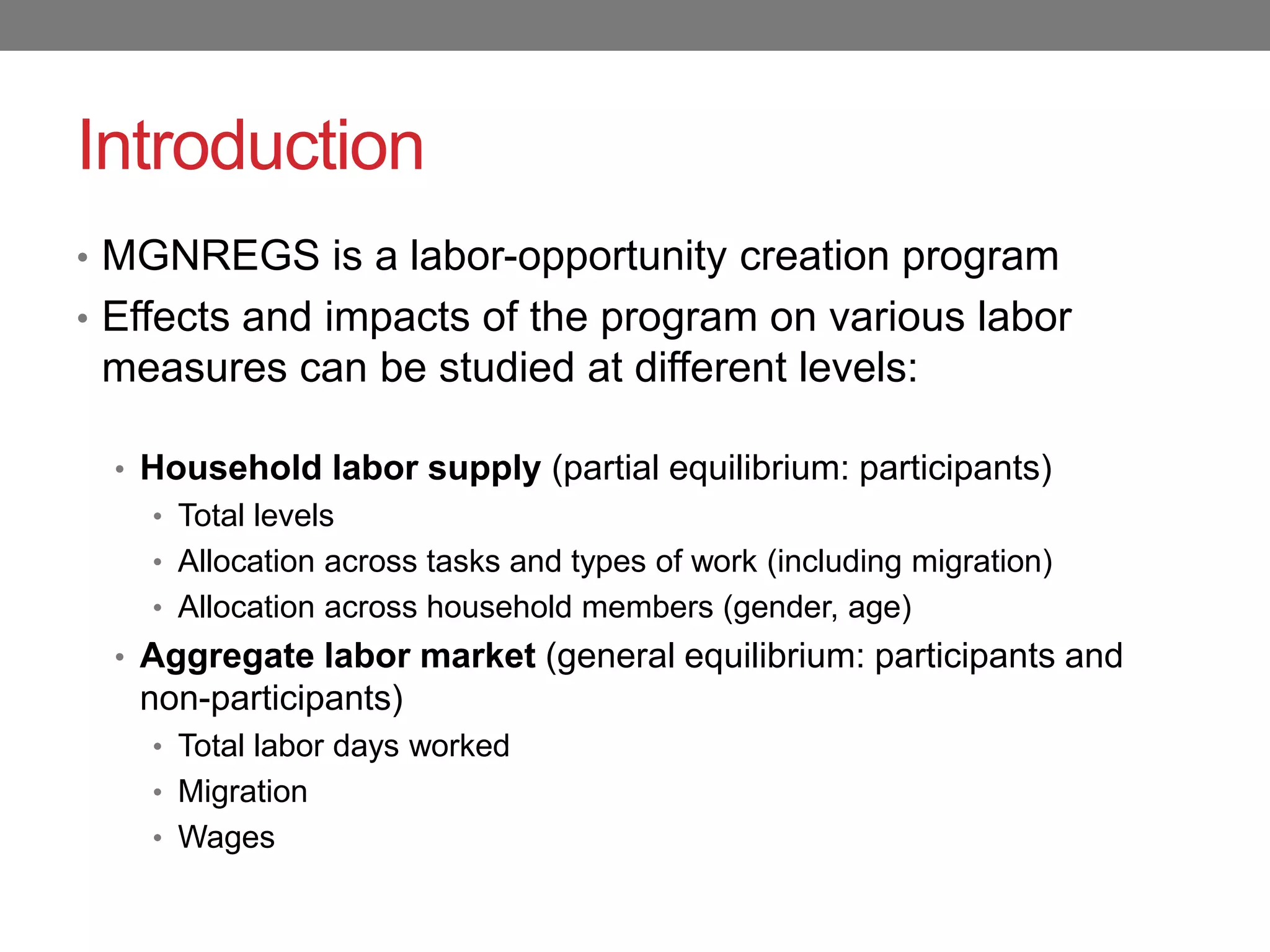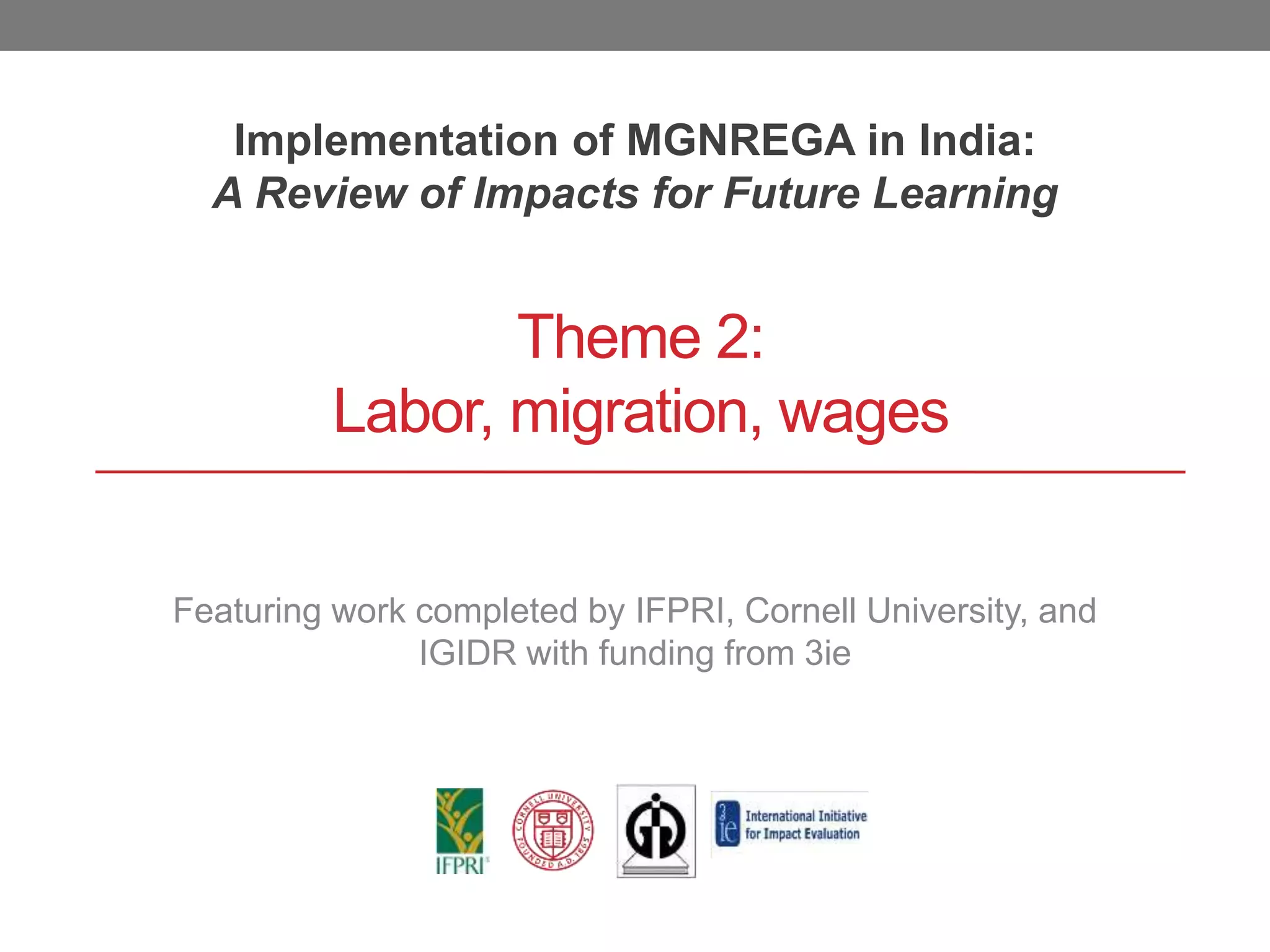 The document reviews the impacts of the Mahatma Gandhi National Rural Employment Guarantee Act (MGNREGA) in India on labor, migration, and wages through various studies and data analyses. It highlights that MGNREGA has enhanced household labor supply, particularly for women, while also showing mixed effects on employment and migration patterns. Additionally, the program has led to an increase in casual labor wages, especially for women, although its overall impact on private sector employment and longer-term migration remains limited.