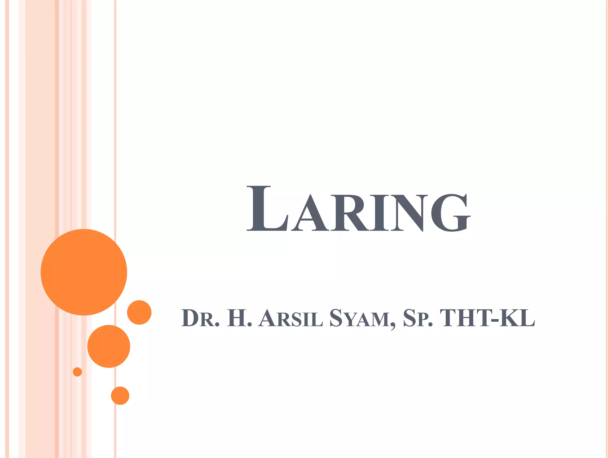 Dokumen ini menjelaskan anatomi laring, termasuk struktur kerangka, bagian dalam, otot-otot, vaskularisasi, sistem limfatik, dan persarafan. Juga dibahas perbedaan laring antara bayi/anak dan dewasa, serta fungsi laring sebagai sfingter dan untuk fonasi. Informasi ini disusun oleh Dr. H. Arsil Syam, SP. THT-KL.