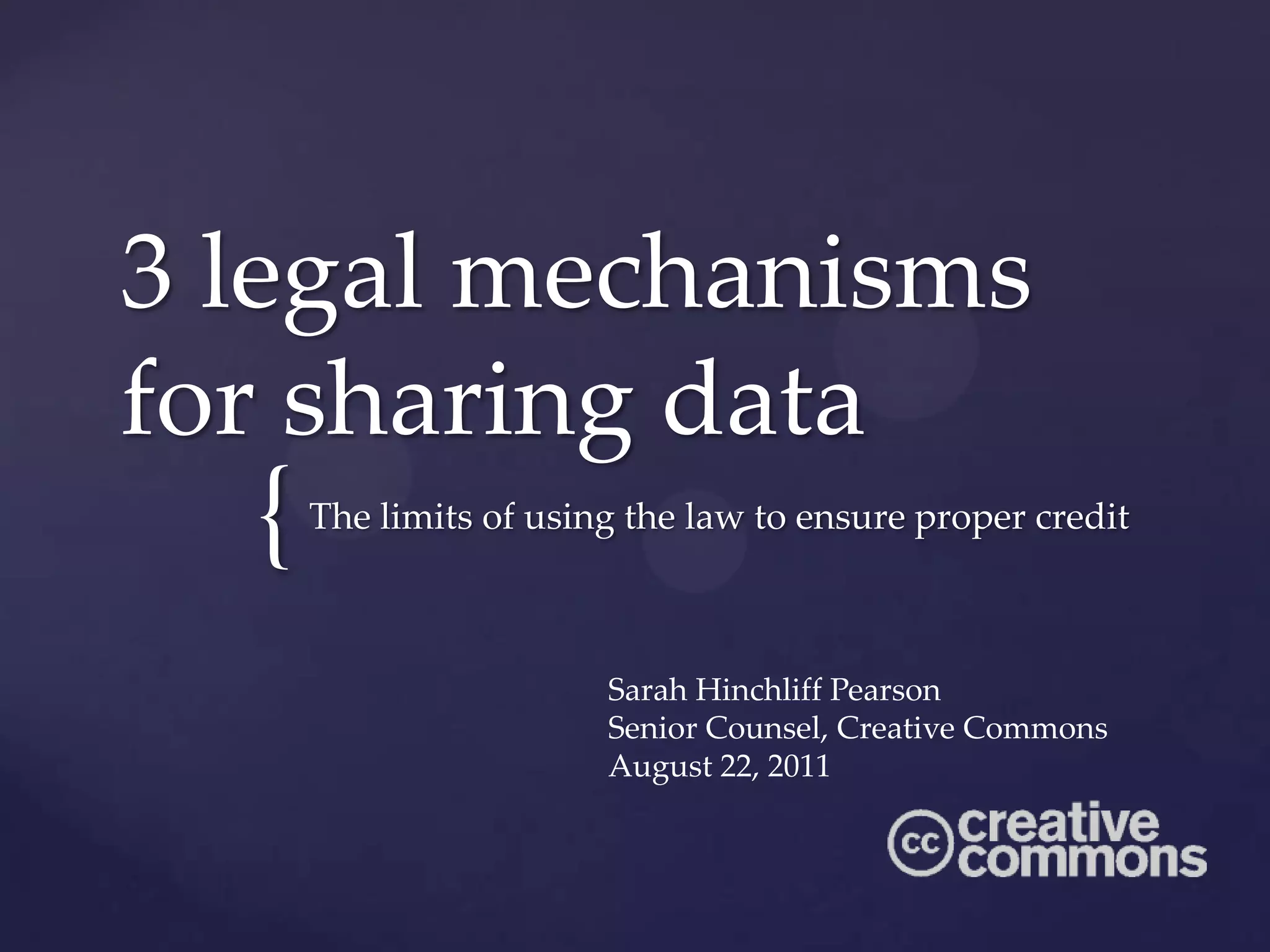 There are 3 legal mechanisms for sharing data while ensuring proper credit: 1) licenses, which grant rights through copyright but require attribution; 2) contracts, which establish attribution norms through bilateral agreements but provide less control than licenses; and 3) waivers, which do not require attribution but also do not provide control over downstream use like licenses and contracts. However, none of these mechanisms alone can perfectly balance credit, control, and open sharing since attribution and credit are not precisely defined by law and can vary depending on social norms.