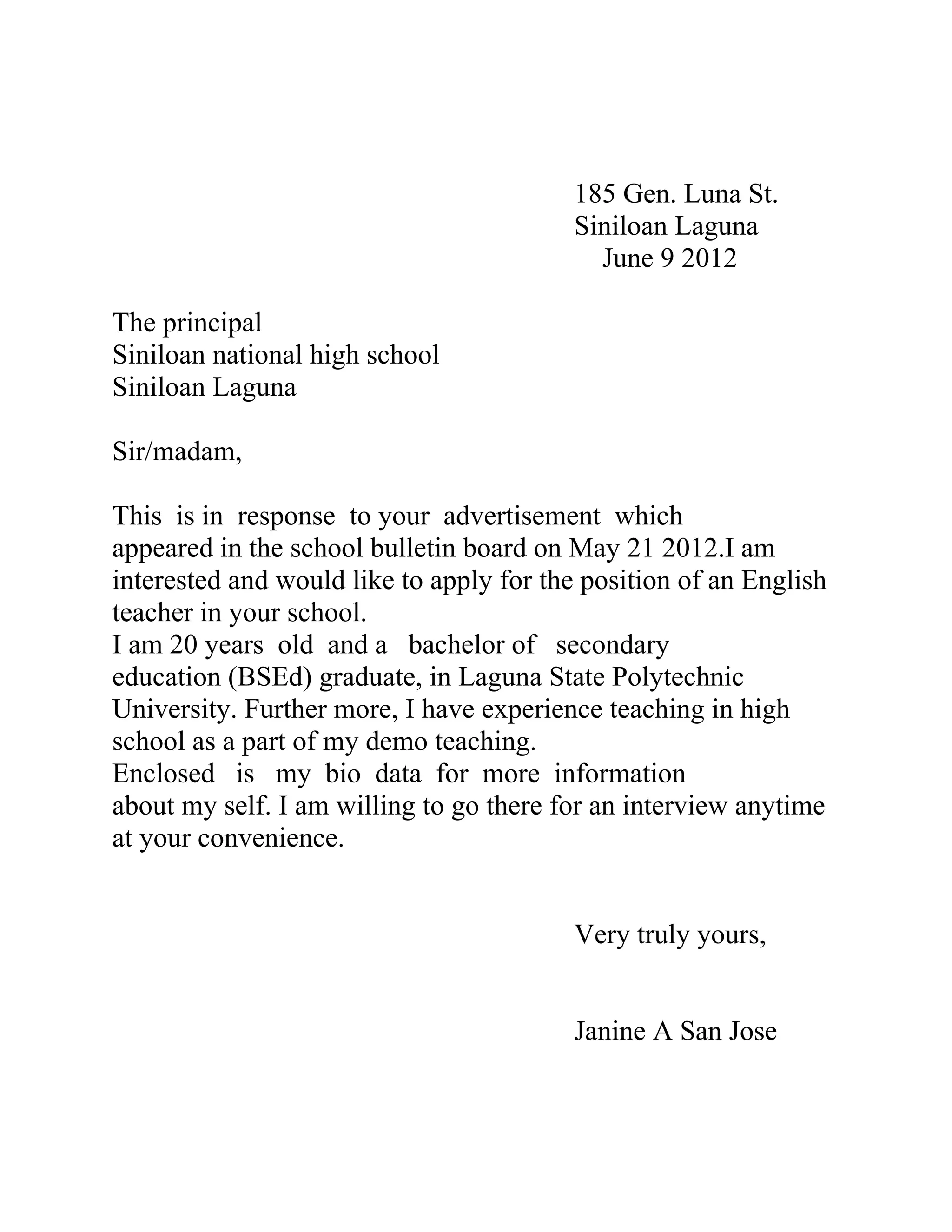Janine A. San Jose applies for an open English teacher position at Siniloan National High School. She recently graduated with a BSEd from Laguna State Polytechnic University and has experience teaching through demo lessons. She encloses her bio data and is available for an interview.