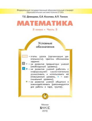Документ описывает федеральный государственный образовательный стандарт для образовательной системы «школа 2100», акцентируя внимание на методиках и задачах по математике для 3 класса. Приведены примеры решений задач, а также практические подходы к обучению умножению и делению. Основное внимание уделяется формированию умений работать с числами и решать практические задачи.