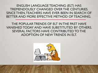 The document discusses 3 major trends in English language teaching technology: 1) Flipped classrooms, which invert traditional content delivery by having students learn new content online before class; 2) Social media integration, as tools like YouTube, Twitter and Snapchat are increasingly used for language learning; 3) Digital games for learning English through an engaging context. Benefits include increased student engagement and the development of language skills. The document provides examples and guidance for implementing these trends in the classroom.